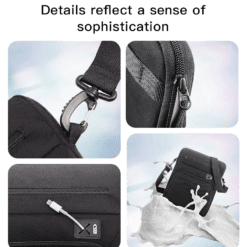 - O compartimento principal comporta seu celular, câmera, carregador portátil, tablet, etc.