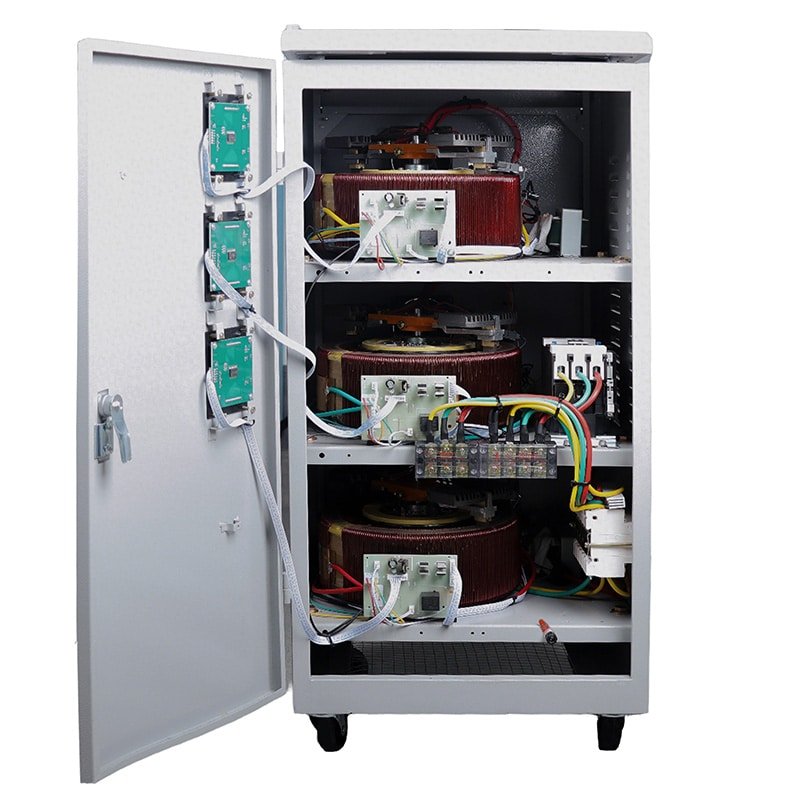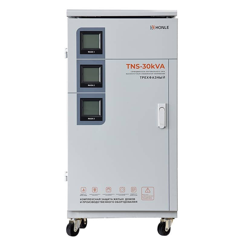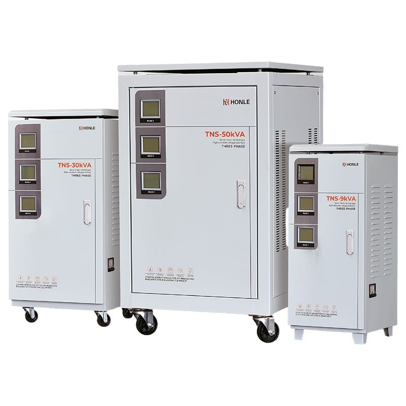 O estabilizador de tensão CA trifásico de alta precisão e totalmente automático da TNS é uma combinação de um estabilizador monofásico de alta funcionalidade. A energia de entrada da rede elétrica é trifásica com quatro fios, e a energia de saída também é trifásica com quatro fios. Possui três medidores elétricos para indicar separadamente as três fases, além de um interruptor de comutação e um voltímetro para comutar e monitorar cada fase. Este estabilizador de tensão apresenta vantagens como tamanho reduzido, peso leve, forma de onda sem distorção, alta eficiência, desempenho confiável e proteção contra retardo de tempo e sobretensão. A série de estabilizadores é de tipo geral, sendo fontes de tensão estabilizadas que podem ser amplamente aplicadas em qualquer situação que exija energia para garantir o funcionamento normal de seus equipamentos.