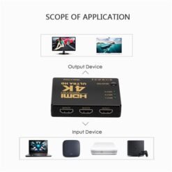 HDMI Switch 3 em 1 out é um pequeno switch HDMI de alto desempenho. É único em design e sofisticado na aparência. Várias entradas se conectam a várias fontes de vídeo HD, como caixas de set-top PS3 e HD. A saída envia sinais de áudio/vídeo HD para um HDTV. Tem boa compatibilidade, compatível com BLU-ray DVD, TV via satélite, PS3, Blu-ray player, Xbox360 … Resolução até 1080P
