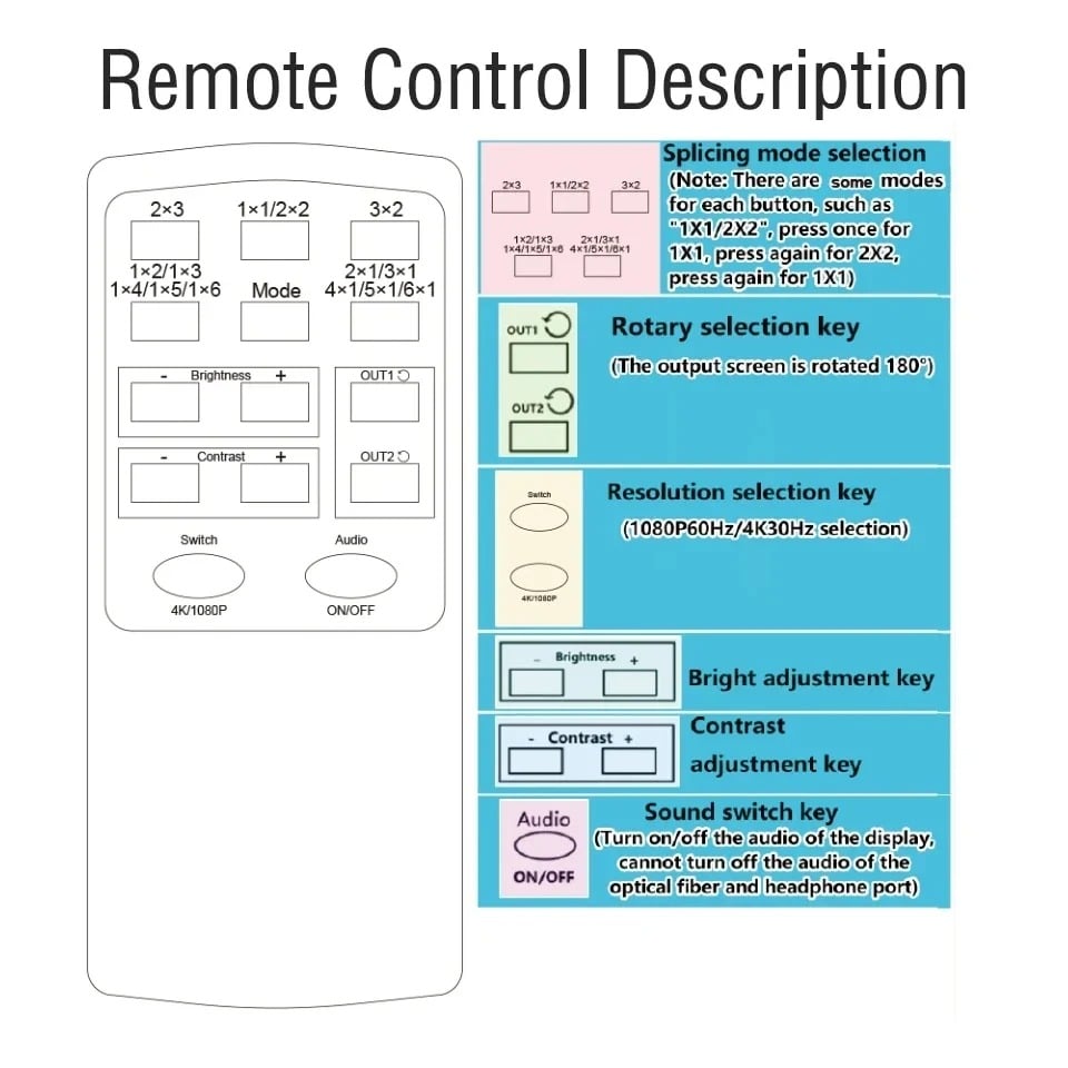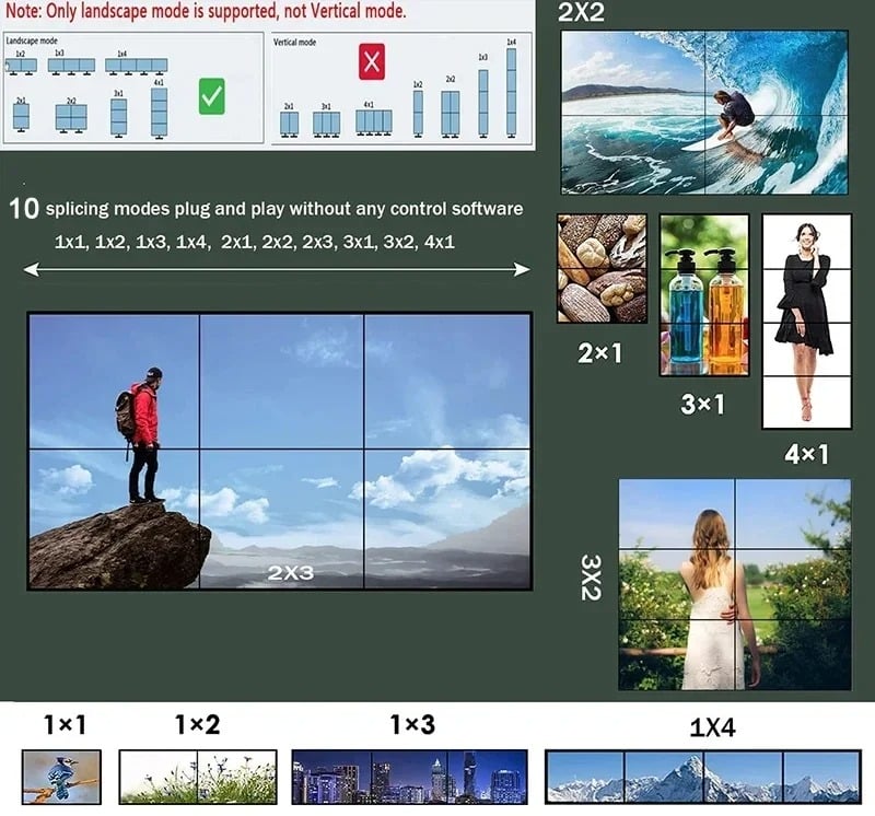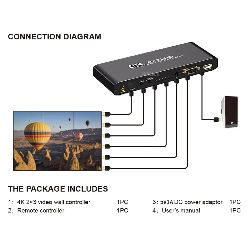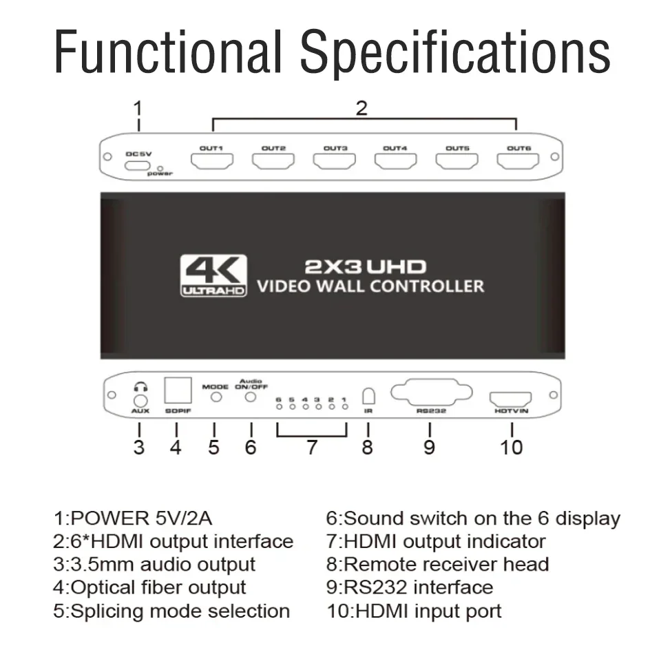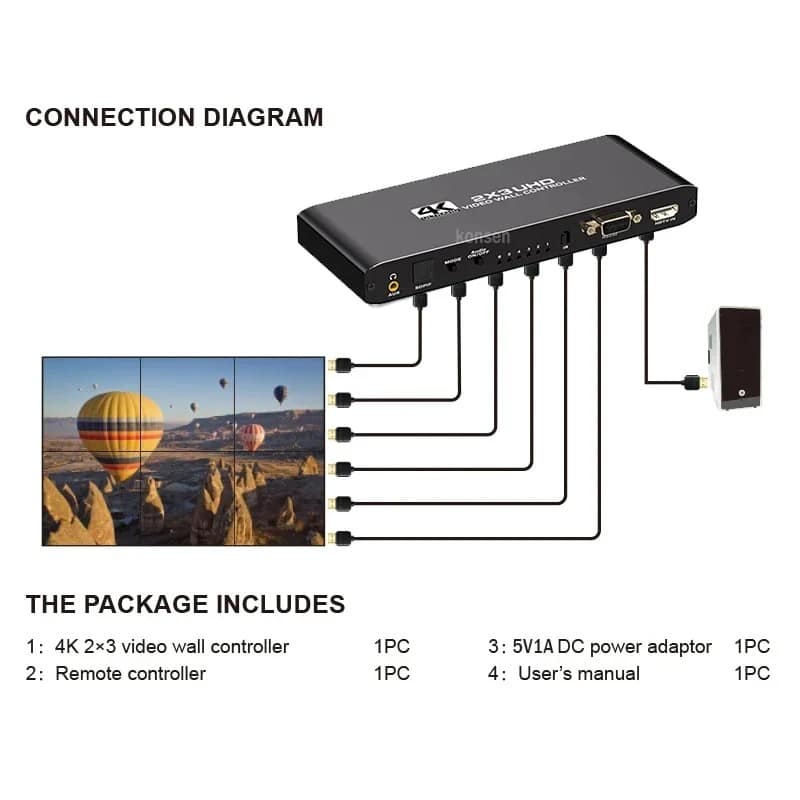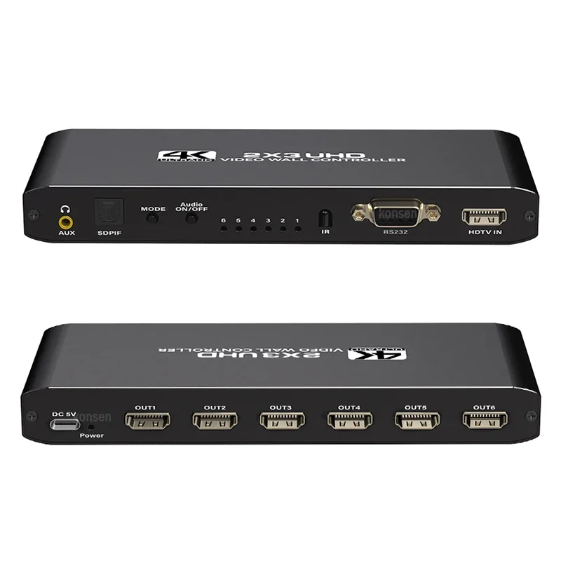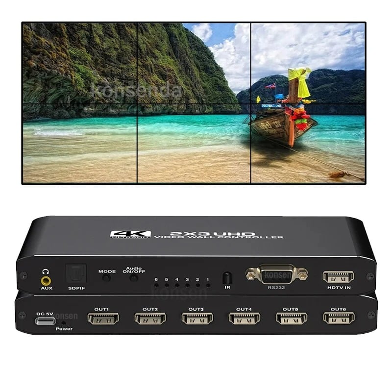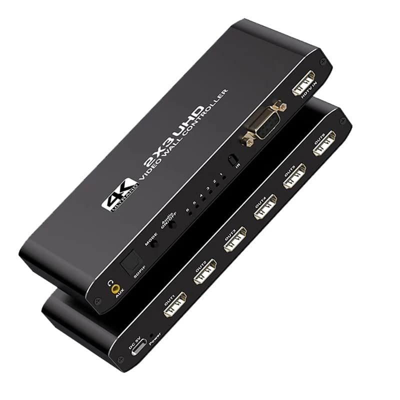 O controlador de vídeo wall 4K 2X3, suporta entrada HDMI 1-way e saída 6 HDMl, a função principal é dividir uma imagem HDMI HD completa em 6 blocos e atribuir a 6 unidade de exibição de vídeo (como unidade de projeção traseira, TV LCD, etc.). Completewith 6 unidades de vídeo de alta definição HDMI paraformar uma grande tela de imagem dinâmica.