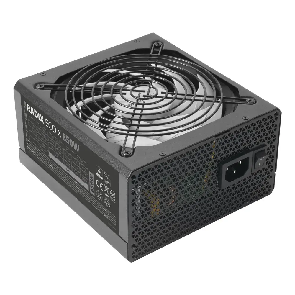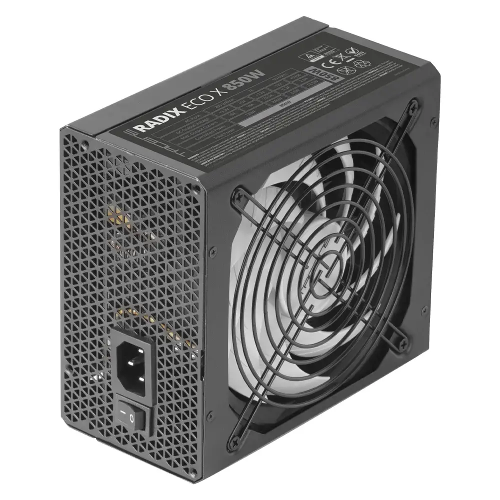 A fonte de alimentação de 850W Tacens RADIX ECO X 850 faz uso da mais recente tecnologia de fabrico SMD de alta precisão e pela tecnologia de conversão DC-DC, PCB de fibra de vidro de camada dupla e componentes de qualidade A para uma fiabilidade total. Produz silêncio máximo graças à nova tecnologia AI-RPM e à ventoinha XL de 140 mm. Proporciona eficiência DIGITAL APFC de 99%, além de eficiência elétrica de 87%, e integra cabos planos pretos extra-longos, bem como 10 sistemas de proteção e segurança incluídos.