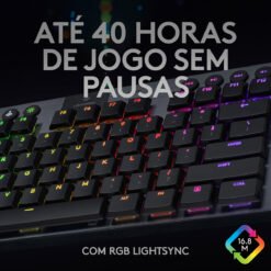 - A tecnologia LIGHTSYNC fornece iluminação RGB que sincroniza a iluminação com quaisquer conteúdos. Personaliza cada tecla ou cria animações personalizadas de aproximadamente16 milhões de cores com o software Logitech G HUB.