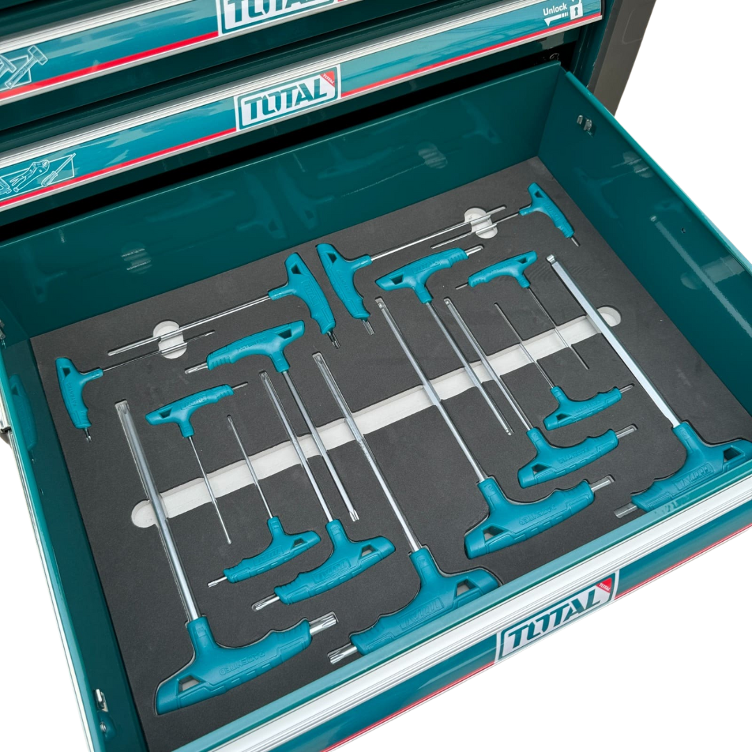 8 chaves hexagonais com cabo em T: 2*75mm, 2,5*75mm, 3x100mm, 4x100mm, 5x150mm, 6x150mm, 8*200mm, 10*200mm;