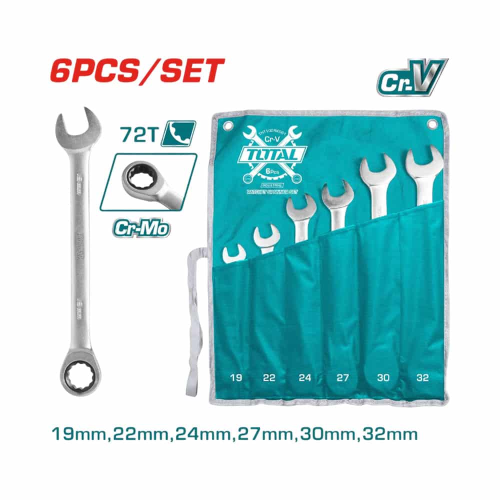 O kit de chaves combinadas Rachet Total THT102RK061 é um conjunto de 6 peças projetado para oferecer excelente funcionalidade e durabilidade. Inclui chaves de catraca nos tamanhos 19 mm, 22 mm, 24 mm, 27 mm, 30 mm e 32 mm, ideais para trabalhar com porcas grandes. Fabricadas em aço cromo-molibdênio (Cr-Mo72) e com fino acabamento polido, essas chaves garantem alta resistência ao desgaste e à corrosão. O sistema de catraca permite um aperto mais eficiente e rápido, facilitando o trabalho em espaços apertados. O conjunto vem em uma bolsa de lona, garantindo fácil transporte e organização. Com peso de 3,75 kg, é uma ferramenta robusta e de alto desempenho, perfeita para profissionais que precisam de ferramentas de qualidade para seus projetos. A embalagem é prática e vem em caixas de 4 unidades, cada uma contendo 6 chaves inglesas.