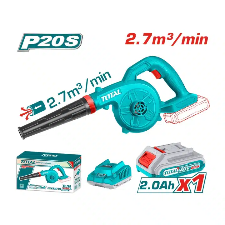 O soprador Total TABLI200281 é um potente soprador sem fio de 20V com velocidade única, que oferece um forte fluxo de ar de até 2,7 m³/min a 18.000 rpm. O kit inclui uma bateria de 2,0 Ah e um carregador rápido compatível com redes de 220–240 V. Leve, com aproximadamente 2,0 kg, este soprador possui uma alça ergonômica e excelente portabilidade, sendo ideal para trabalhos externos como limpeza de folhas, poeira ou detritos. Compatível com a plataforma de baterias P20S da Total.