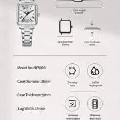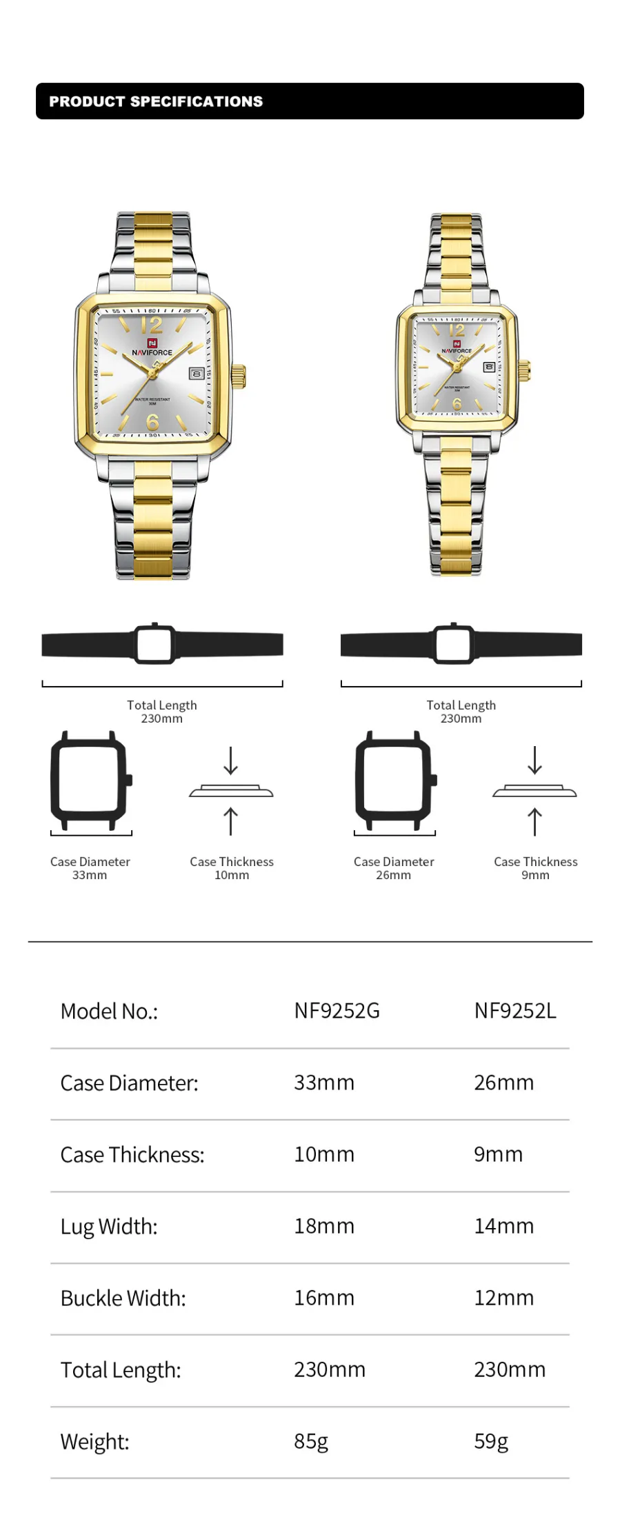 Diâmetro do mostrador: 33 mm (masculino), 26 mm (feminino)