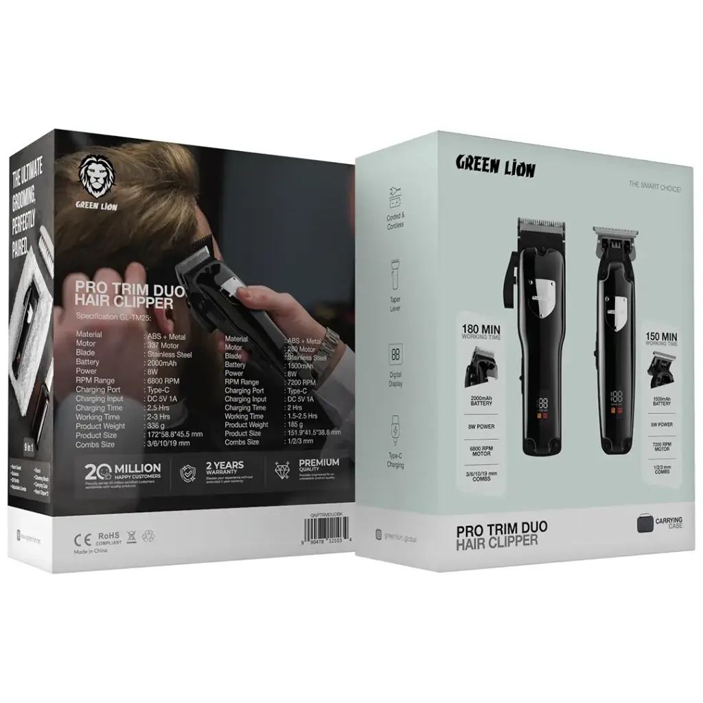 A máquina de cortar cabelo Green Lion Pro Trim Duo é uma ferramenta de cuidados pessoais incrivelmente versátil, projetada para precisão, resistência e desempenho. Equipada com um motor 337 e lâminas de aço inoxidável, esta máquina oferece uma rotação robusta de 6800 RPM para um corte de cabelo rápido e preciso. Sua bateria de 2000mAh oferece de 2 a 3 horas de uso sem fio, com a possibilidade de recarga rápida em até 2,5 horas via cabo USB-C. Os pentes inclusos de 3/6/10/19 mm permitem ajustes de comprimento para diversos estilos. A máquina, com motor 280 e rotação de 7200 RPM, é ideal para aparar pelos do corpo com precisão. Ela também inclui pentes de 1/2/3 mm e uma bateria de 1500mAh com autonomia de 1,5 a 2,5 horas e recarga em 2 horas via cabo USB-C. Ambos os acessórios são feitos de ABS e metal para maior durabilidade e possuem um visor digital que indica o nível da bateria. O Green Lion Pro Trim Duo é o seu aparador de pelos confiável, com ou sem fio, que oferece ajuste de altura de corte.