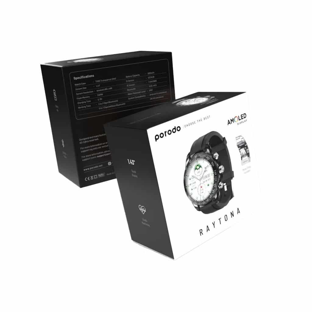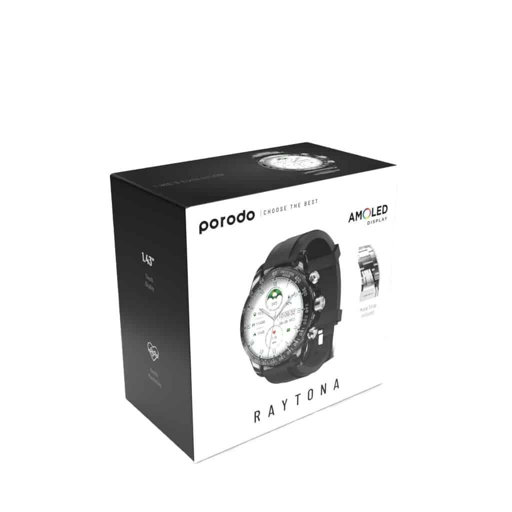 O Smartwatch Porodo RAYTONA, disponível com pulseiras de silicone e metal, possui uma tela AMOLED de 1,43″ com resolução nítida de 466×466. Inclui sensores avançados para monitoramento de frequência cardíaca e oxigenação sanguínea. Com 128 MB de memória flash e bateria de 260 mAh, suporta carregamento sem fio e é compatível com dispositivos Android 5.0+ e iOS 9.0+. O Smartwatch RAYTONA é um acessório magnífico e elegante para o seu dia a dia.