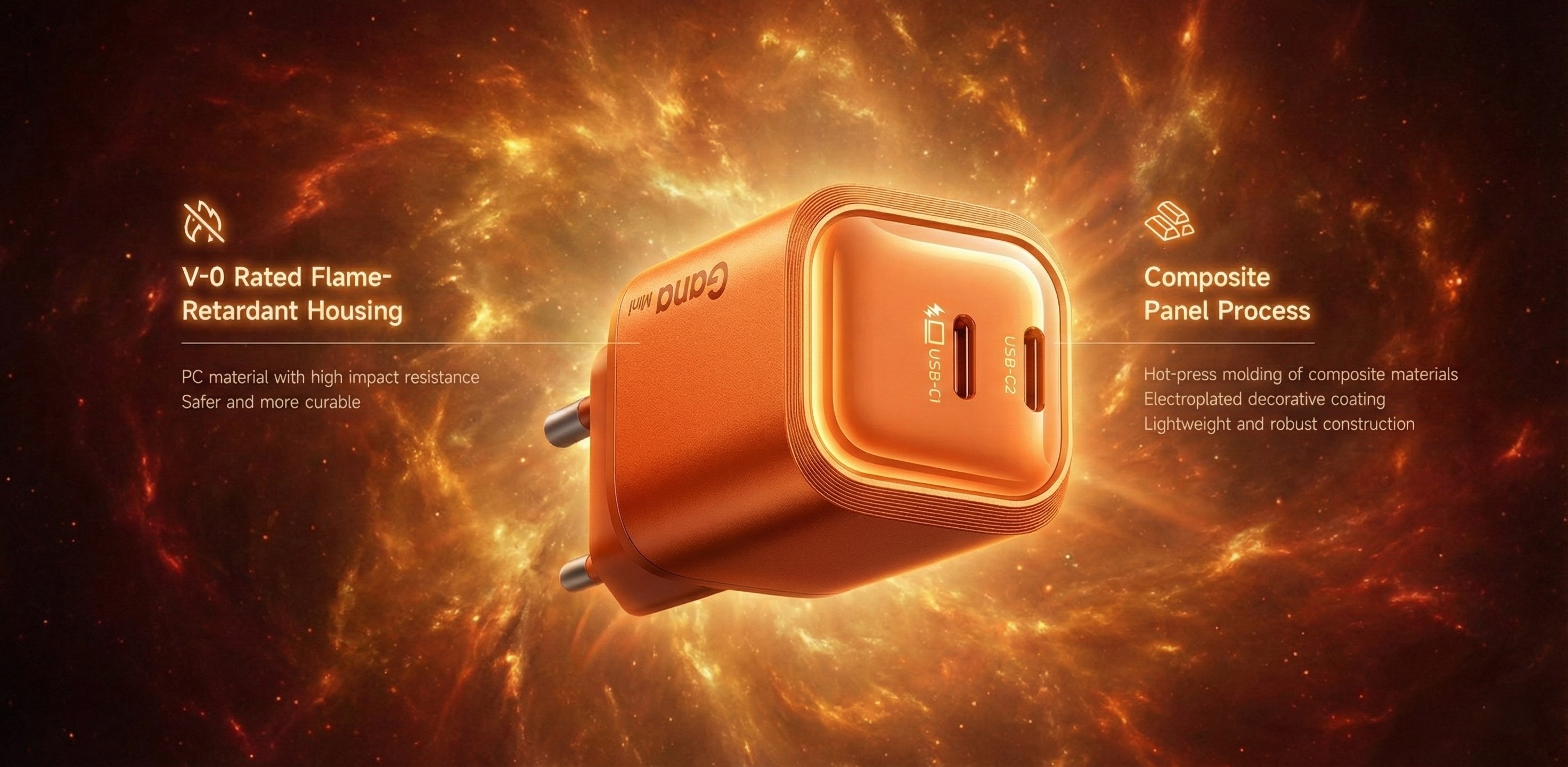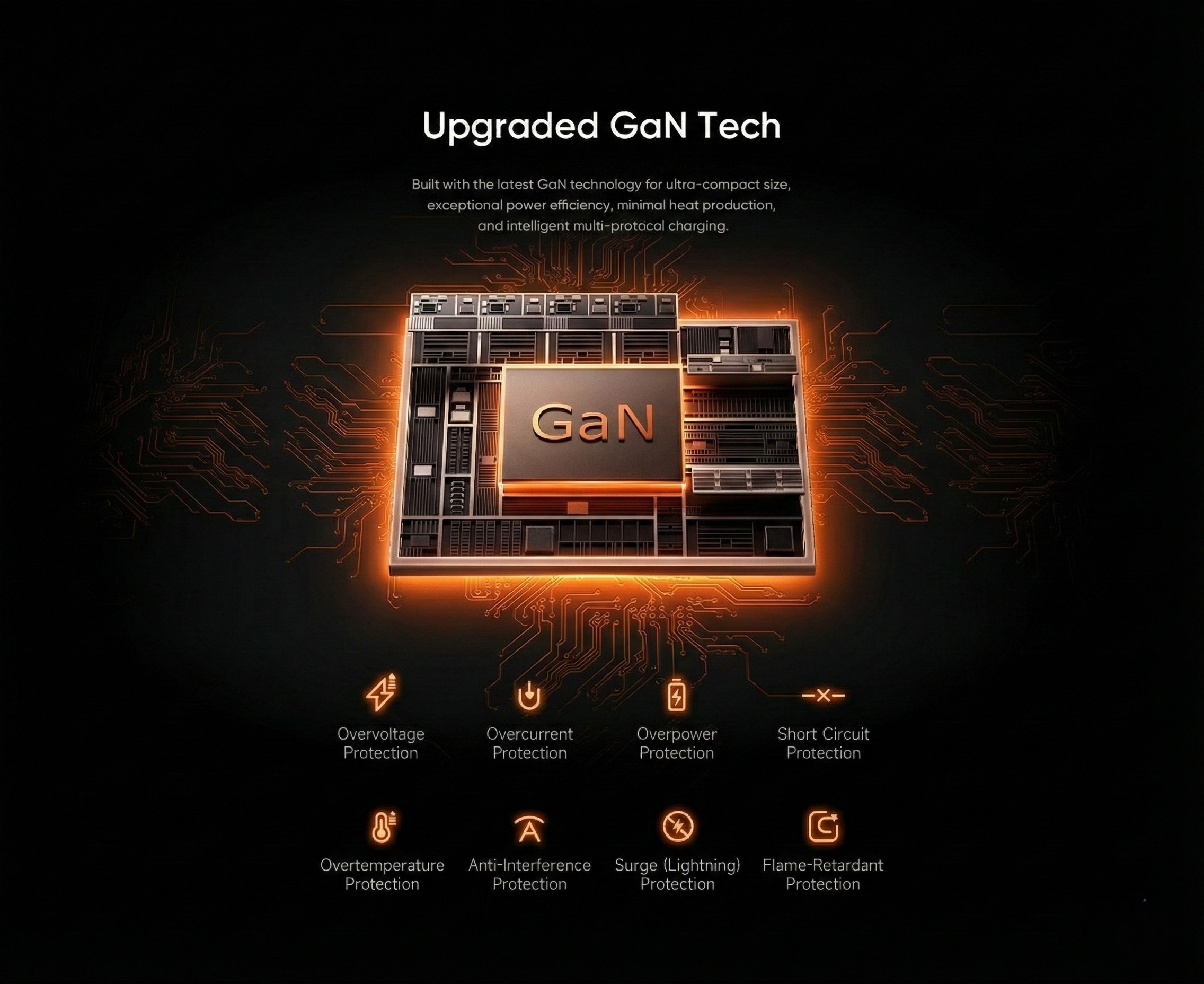 - Chipset GaN de alta eficiência – fornecimento de energia estável e seguro.