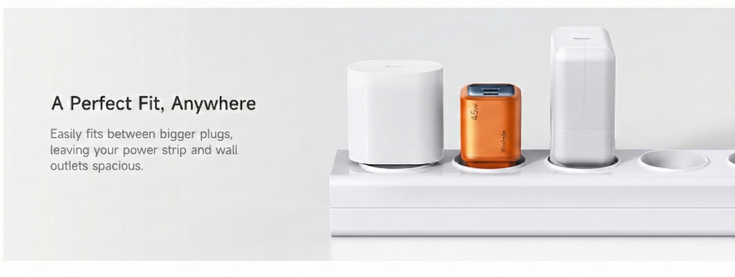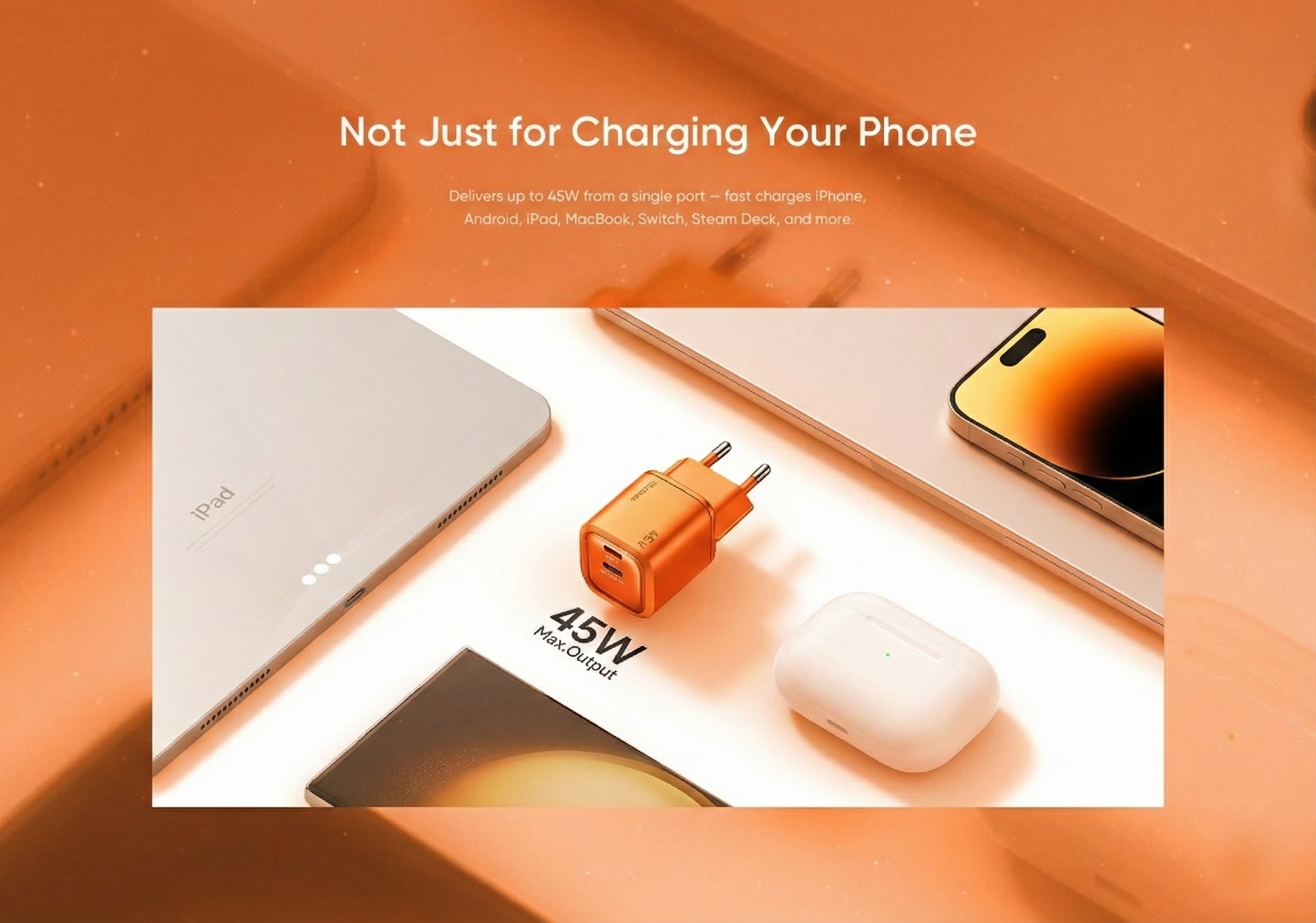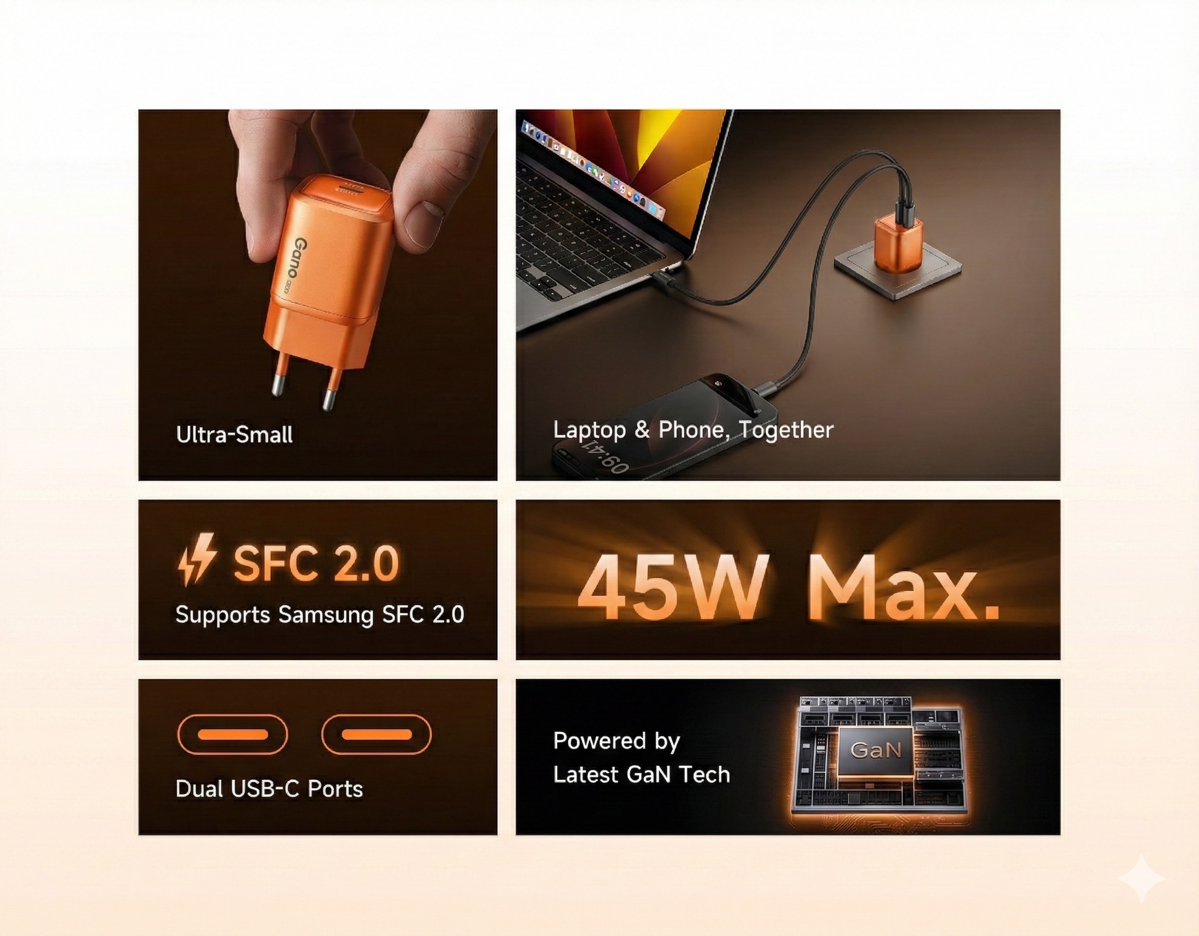 - Carregamento rápido GaN de 45 W – mais rápido, mais frio e mais eficiente.